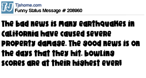 X says The bad news is many earthquakes in California have caused severe property damage. The good news is on the days that they hit, bowling scores are at their highest ever!