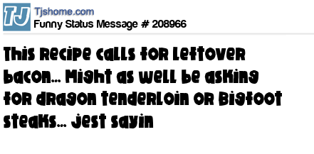 X says This recipe calls for leftover bacon… Might as well be asking for dragon tenderloin or Bigfoot steaks… jest sayin