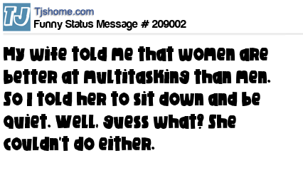 - # 209975 My wife told me that women are better at multitasking than men. So I asked her to sit down and be quiet. She couldn't do either.