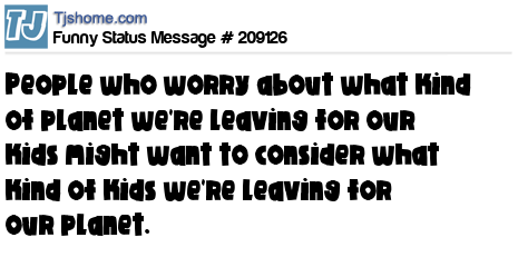 - # 137590 I dont care one Iota about leaving a better planet for our kids. I think we should be focused on leaving better kids for our planet.....