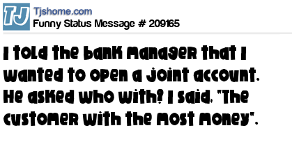 - # 208746 I told the bank manager that I wanted to open a joint account. He asked who with? I said, the customer with the most money.