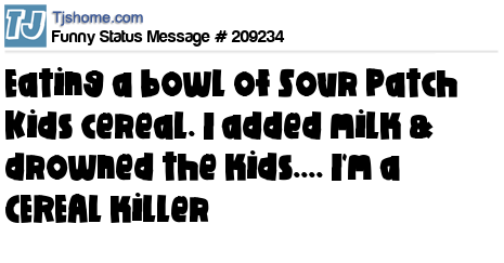 X says Eating a bowl of Sour Patch Kids cereal. I added milk & drowned the kids.... I'm a CEREAL killer