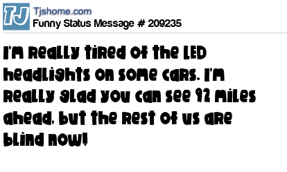 - # 209526 I'm really tired of the LED headlights on some cars. I'm really glad you can see 92 miles ahead, but the rest of us are blind now.