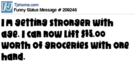 - # 208833 I’m getting stronger with age. I can now lift $100 worth of groceries with one hand.