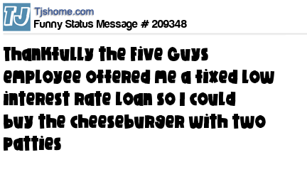X says Thankfully the Five Guys employee offered me a fixed low interest rate loan so I could buy the cheeseburger with two patties
