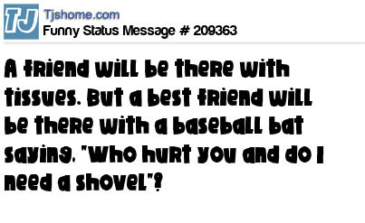 X is A friend will be there with tissues. But a best friend will be there with a baseball bat saying, "Who hurt you and do I need a shovel"?