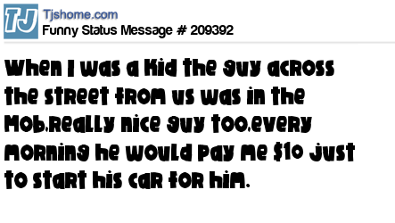 X says When I was a kid the guy across the street from us was in the Mob,really nice guy too,every morning he would pay me $10 just to start his car for him.