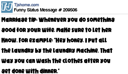 - # 201850 Marriage tip #4: Whenever you do something good for your wife, make sure to let her know. For example: "Hey honey, I put all the laundry by the laundry machine. That way you can wash the clothes after you get done with dinner."