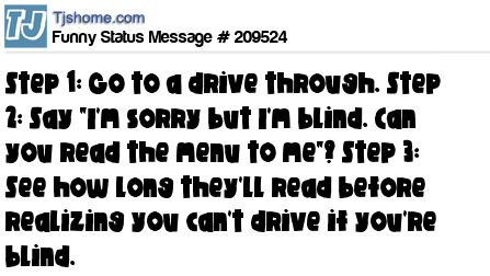 X is Step 1: Go to a drive through. Step 2: Say "I'm sorry but I'm blind. Can you read the menu to me"? Step 3: See how long they'll read before realizing you can't drive if you're blind.