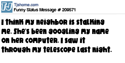 - # 69944 I think my neighbor is stalking me as she's been googling my name on her computer. I saw it through my telescope last night.