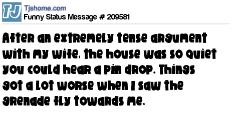 X is After an extremely tense argument with my wife, the house was so quiet you could hear a pin drop. Things got a lot worse when I saw the grenade fly towards me.