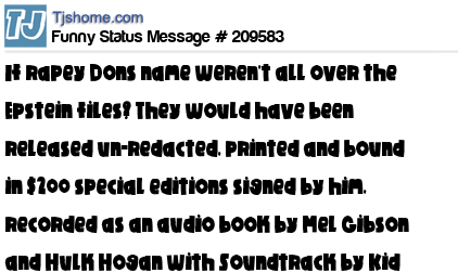 X is If rapey Dons name weren't all over the Epstein files? They would have been released un-redacted, printed and bound in $200 special editions signed by him, recorded as an audio book by Mel Gibson and Hulk Hogan with Soundtrack by Kid Rock and Ted Nugent,