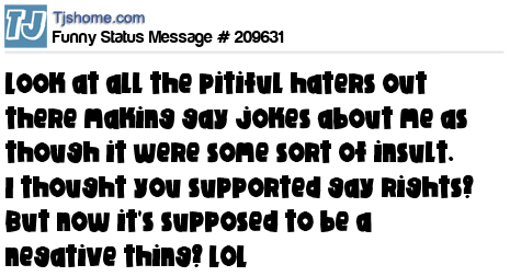 X is Look at all the pitiful haters out there making gay jokes about me as though it were some sort of insult. I thought you supported gay rights? But now it's supposed to be a negative thing? LOL