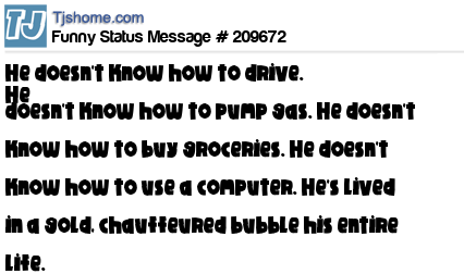 - # 209673 He doesn't know how to drive. He doesn't know how to pump gas. He doesn't know how to buy groceries. He doesn't know how to use a computer. He's lived in a gold, chauffeured bubble his entire life. And so many of you think he's great LMFAO