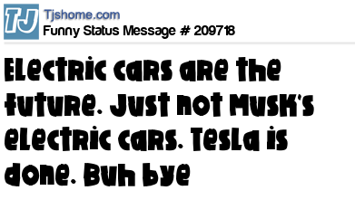 X is Electric cars are the future. Just not Musk's electric cars. Tesla is done. Buh bye