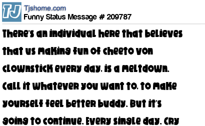 X is There's an individual here that believes that us making fun of cheeto von clownstick every day, is a meltdown. Call it whatever you want to, to make yourself feel better buddy. But it's going to continue. Every single day. Cry harder.