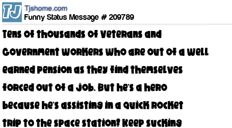 X is Tens of thousands of Veterans and Government workers who are out of a well earned pension as they find themselves forced out of a job. But he's a hero because he's assisting in a quick rocket trip to the space station? Keep sucking Elons c*** and balls.