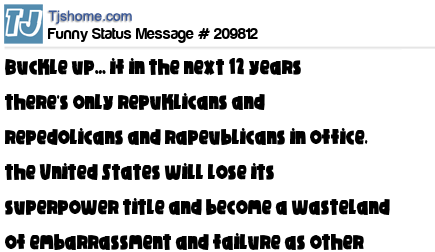 X is Buckle up… if in the next 12 years there's only repuklicans and repedolicans and rapeublicans in office, the United States will lose its superpower title and become a wasteland of embarrassment and failure as other countries cancel it.