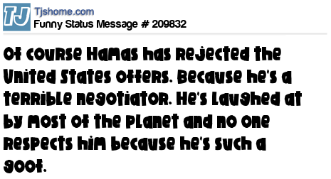 X is Of course Hamas has rejected the United States offers. Because he's a terrible negotiator. He's laughed at by most of the planet and no one respects him because he's such a goof.