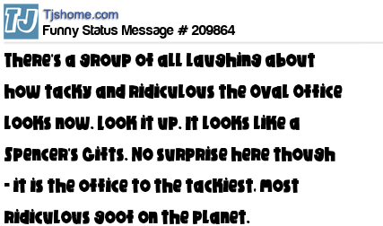 X is There's a group of all laughing about how tacky and ridiculous the Oval Office looks now. Look it up. It looks like a Spencer's Gifts. No surprise here though - it is the office to the tackiest, most ridiculous goof on the planet.