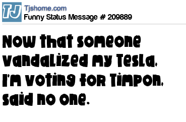 X says Now that someone vandalized my Tesla, I'm voting for Timpon, said no one.