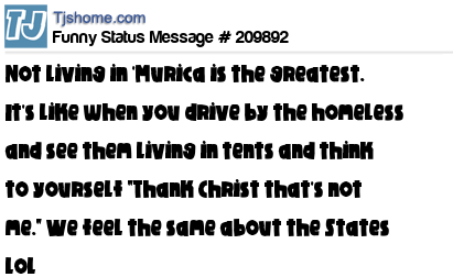 - # 209891 Not living in America is the greatest. It's like when you drive by the homeless and see them living in tents and think to yourself "Thank Christ that's not me." We feel the same about the States lol