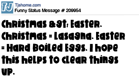 X says Christmas > Easter. Christmas = Lasagna. Easter = Hard Boiled Eggs. I hope this helps to clear things up.