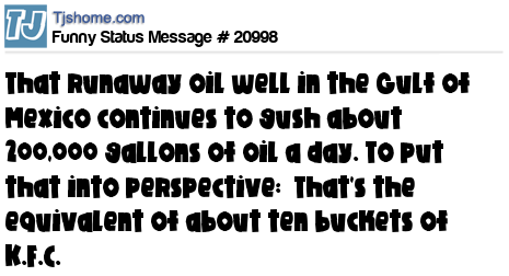 X That runaway oil well in the Gulf of Mexico continues to gush about 200,000 gallons of oil a day. To put that into perspective: That's the equivalent of about ten buckets of K.F.C.