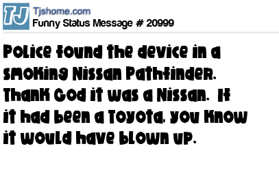 X Police found the device in a smoking Nissan Pathfinder. Thank God it was a Nissan. If it had been a Toyota, you know it would have blown up.