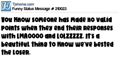 X says You know someone has made no valid points when they end their responses with LMAOOOO and LOLZZZZZ. It's a beautiful thing to know we've bested the loser.