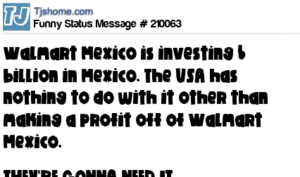 - # 210047 Walmart Mexico is investing 6 billion in Mexico. Not Walmart America investing 6 billion in Mexican Walmart. Sheesh.