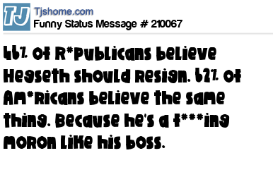X is 46% of R*publicans believe Hegseth should resign. 62% of Am*ricans believe the same thing. Because he's a f***ing moron like his boss.