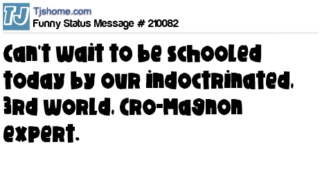 - # 210081 Can't wait to be schooled today by our indoctrinated, 3rd world, Cro-Magnon political expert. LOLZZZZ LMAOOOO