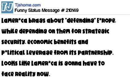 - # 210148 Lamerica brags about "defending" E*rope, while depending on them for strategic security, economic benefits and political leverage from its partnership. Looks like Lamerica is gonna have to face reality now.