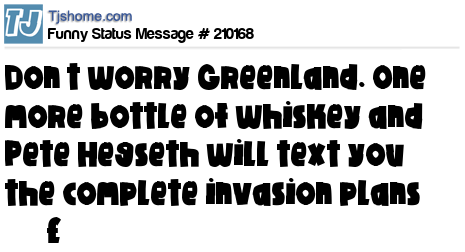 X is Don’t worry Greenland. One more bottle of whiskey and Pete Hegseth will text you the complete invasion plans 🤣
