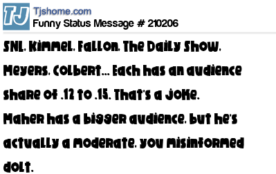 X says SNL, Kimmel, Fallon, The Daily Show, Meyers, Colbert... Each has an audience share of .12 to .15. That's a joke. Maher has a bigger audience, but he's actually a moderate, you misinformed dolt.
