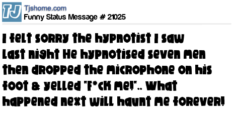 - # 88502 I feel sorry for the hypnotist I saw last night. He hypnotized 7 guys then dropped the mic on his left foot and yelled, "F*ck me." What happened next will haunt me for the rest of my life.