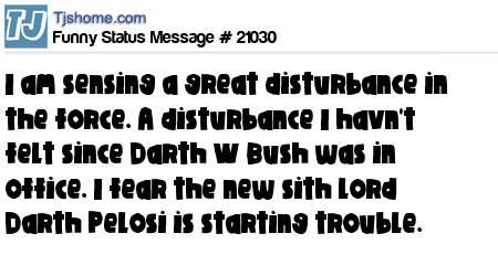 X I am sensing a great disturbance in the force. A disturbance I havn't felt since Darth W Bush was in office. I fear the new sith lord Darth Pelosi is starting trouble.