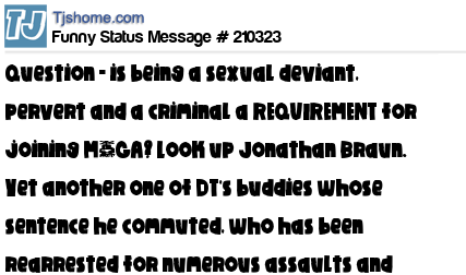 X is Question - is being a sexual deviant, pervert and a criminal a REQUIREMENT for joining M^GA? Look up Jonathan Braun. Yet another one of DT's buddies whose sentence he commuted, who has been rearrested for numerous assaults and crimes against children.