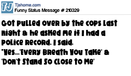 - # 47326 Got pulled over by the cops today and he ask me if I had a police record ..... I said yes ....every breath you take and don't stand so close to me........ Now what is my lawyer phone number