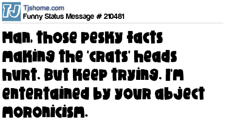 X says Man, those pesky facts making the 'crats' heads hurt. But keep trying. I'm entertained by your abject moronicism.