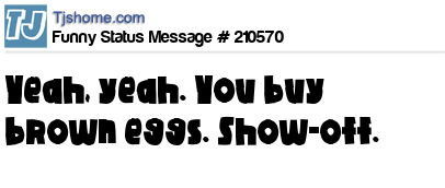 X says Yeah, yeah. You buy brown eggs. Show-off.