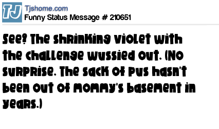 X says See? The shrinking violet with the challenge wussied out. (No surprise. The sack of pus hasn't been out of mommy's basement in years.)