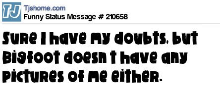 - # 55847 I killed Bigfoot! I also have a few aliens in my basement! You gotta trust me because I said so! Oh by the way I have pictures but you can't look at them!
