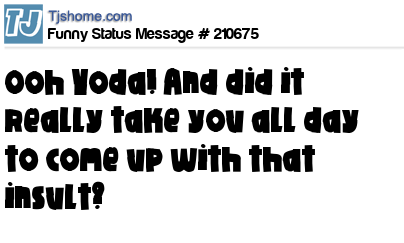 - # 210678 Oh ok Yoda! Looked to me like you took about 7 hours to come up with that insult. But that's ok. I know it runs in your family because it took your mom 9 months to make a joke.