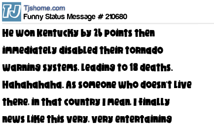 - # 210681 He won Kentucky by 26 points then immediately disabled their tornado warning systems, leading to 18 deaths. Hahahahaha. As someone who doesn't live there, in that country I mean, I find news like this very, very entertaining and funny 😂