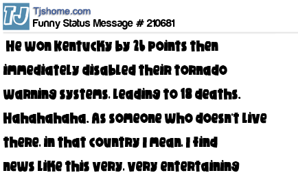 - # 210680 He won Kentucky by 26 points then immediately disabled their tornado warning systems, leading to 18 deaths. Hahahahaha. As someone who doesn't live there, in that country I mean, I finally news like this very, very entertaining and funny 😂