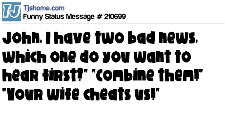 X says John, I have two bad news, which one do you want to hear first?" "Combine them!" "Your wife cheats us!"