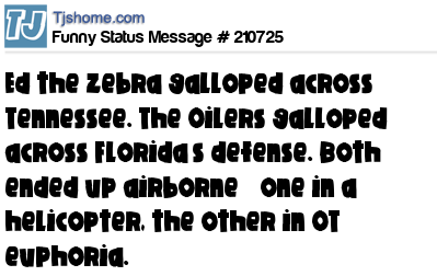 X says Ed the zebra galloped across Tennessee. The Oilers galloped across Florida’s defense. Both ended up airborne—one in a helicopter, the other in OT euphoria.