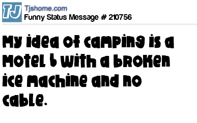 X says My idea of camping is a Motel 6 with a broken ice machine and no cable.